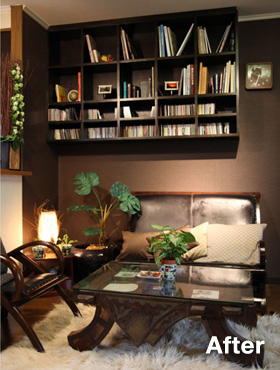 書棚側面のクロスも、書棚に出来る限りマッチした物を厳選し、落ち着く空間になるようにしました。
